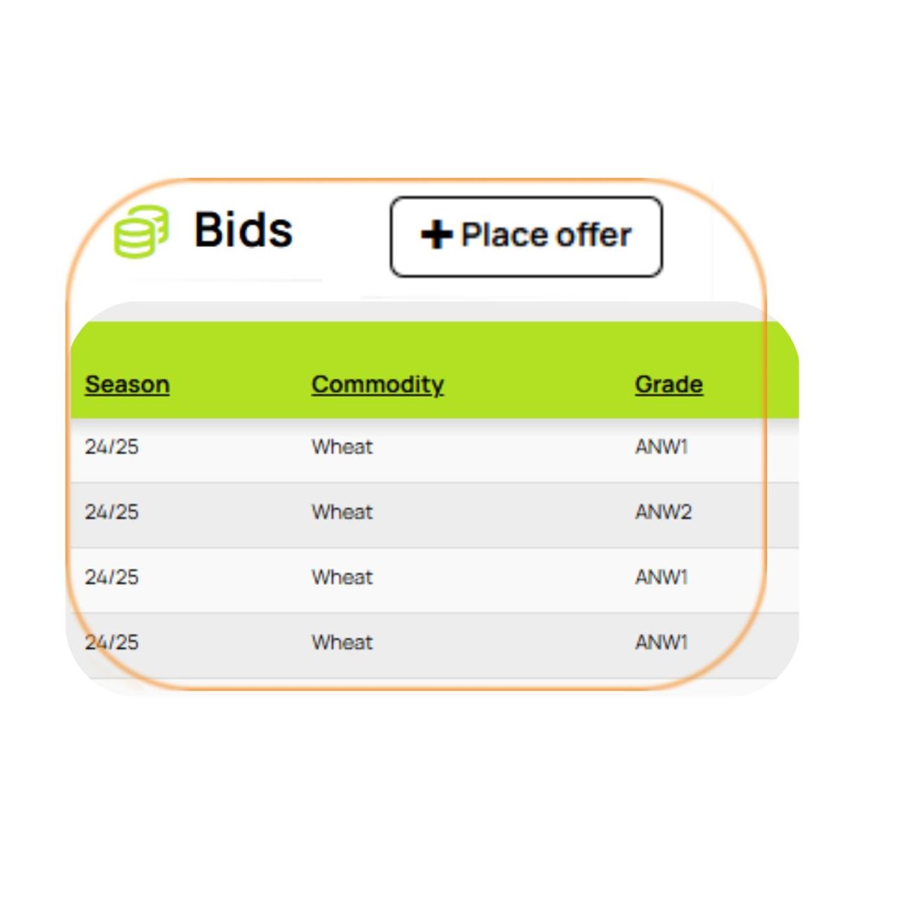 MarketPlace helps match grower offers and Buyer bids. It is a low-cost marketing tool for DailyGrain members. You can always view your own trading activity in real time. With automatic nomination for Spot trades, market analytics and visibility of offers, bids and trades, MarketPlace is an essential tool for all your grain marketing.